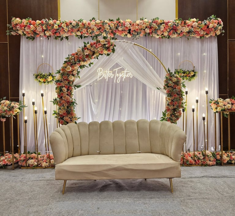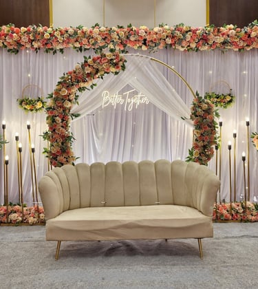 Elegant ring ceremony stage, floral arrangements, lighting décor & entrance styling. We create romantic and premium engagement themes.