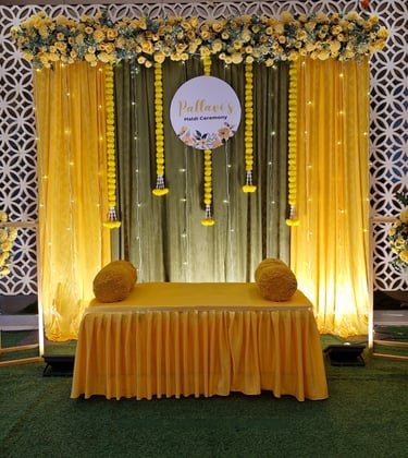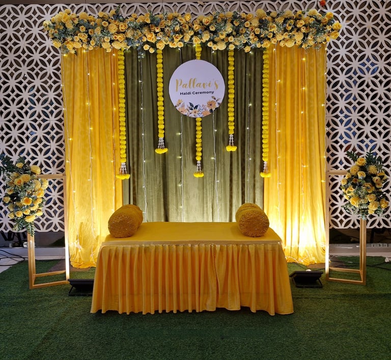 Vibrant marigold décor, yellow themes, floral swings & traditional props. Perfect Haldi ceremony vibes with cultural touch.
