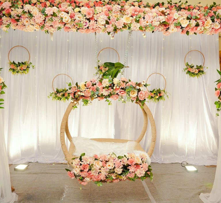 Traditional cradle stage, floral décor, name reveal setup & family photo areas. Pure, beautiful, and emotion-filled celebrations.