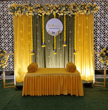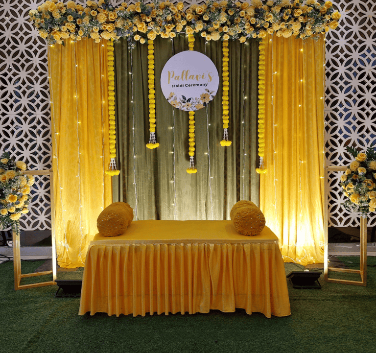 Vibrant marigold décor, yellow themes, floral swings & traditional props. Perfect Haldi ceremony vibes with cultural touch.