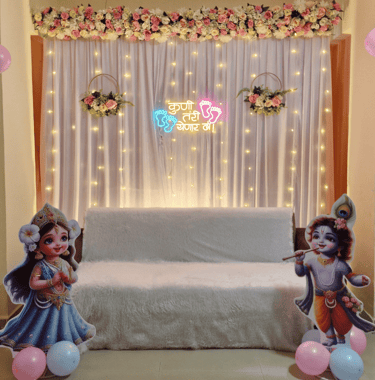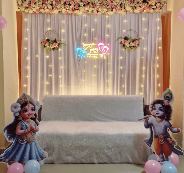 Soft pastel décor, mom-to-be setup, welcome board, floral themes & backdrop styling. Cute, elegant, and full of blessings & memories.